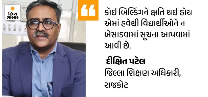 'ક્ષતિગ્રસ્ત બિલ્ડિંગમાં હવેથી વિદ્યાર્થીઓને ન બેસાડવા' અત્યારે ધોરાજી અને જેતપુર બંને તાલુકાની તમામ શાળાઓમાં બાળકોને રજા આપી દેવામાં આવી છે. આ ઉપરાંત કોઇ બિલ્ડિંગને ક્ષતિ થઇ હોય એમાં હવેથી વિદ્યાર્થીઓને ન બેસાડવામાં સૂચના આપવામાં આવી છે. જેનો અમે પાછળથી સર્વે કરાવીશું. ધોરાજી તાલુકાની 48 શાળાઓ અને જેતપુર તાલુકાની 70 શાળાઓમાં રજા જાહેર કરાઇ છે. અમે શાળાના આચાર્યોને જ સૂચના આપી છે કે તમને એવું લાગે તો તમે વિદ્યાર્થીઓને રજા આપી દેજો.