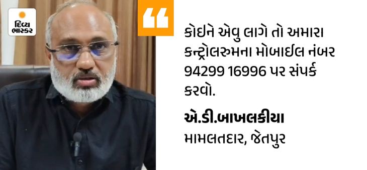 લોકોને ખોટી અફવામાં આવવું નહીં: મામલતદાર આ અંગે જેતપુર મામલતદાર એ.ડી.બાખલકીયાએ જણાવ્યું કે, અમે ટીડીઓ, ચીફ ઓફિસર અને શિક્ષણ વિભાગની મિટિંગ રાખી છે અને અમે એક કન્ટ્રોલરુમ ચાલુ કર્યો છે. લોકોને ખોટી અફવામાં આવવું નહીં અને એવું લાગે તો તમારે સુરક્ષિત જગ્યાએ જતા રહેવું અને અમારા કન્ટ્રોલરુમના મોબાઈલ નંબર 9429916996 પર સંપર્ક કરવો. શાળાઓમાં બાળકોને રજા આપવામાં આવી છે, પણ ગ્રામ્ય વિસ્તારોમાં શિક્ષકોને હાજર રહેવા માટે સૂચના આપી છે.