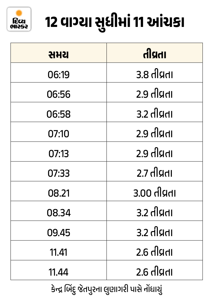 6 કલાકમાં ભૂકંપના 11 આંચકા ગઇકાલે સાંજે 8 વાગ્યાને 43 મિનિટે પહેલો આંચકો અનુભવાયો હતો. જેનું કેન્દ્ર બિંદુ ઉપલેટાથી 30 કિલોમીટર દૂર નોંધાયું હતું. જ્યારે આજે વહેલી સવારે છ વાગ્યાથી 12 વાગ્યા સુધીમાં છ કલાકમાં 11 આંચકા નોંધાતા લોકોના જીવ અધ્ધ થઇ ગયા છે. આ તમામ આંચકાનું કેન્દ્ર બિંદુ જેતપુરના લુણાગરી ગામ આજુ બાજુ જ નોંધાયું છે. જ્યારે તીવ્રતા 2.6 થી 3.8ની હોવાનું જાણવા મળ્યું છે.